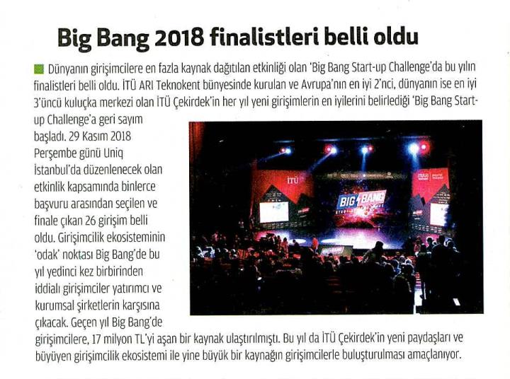 Dünyanın giriişimcilere en fazla kaynak dağıtılan etkinliği olan 'Big Bang Start-up Challenge' da bu yılın finalistleri belli oldu. İTÜ ARI Teknokent bünyesinde kurulan ve Avrupa' nın en iyi 2' nci, dünyanın ise en iyi 3' ncü kuluçka merkezi olan İTÜ Çekirdek' in her yıl yeni girişimlerin en iyilerini belirlediği 'Big Bang Start-up Challenge' a geri sayım başladı.