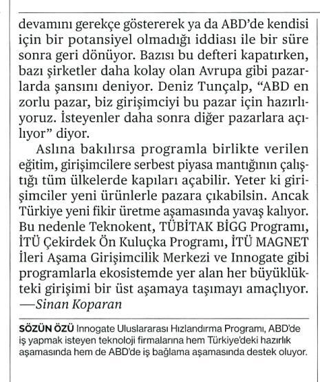 İTÜ ARI Teknokent liderliğinde, İSTKA desteği ile hayata geçirilen Innogate Hızlandırma Programı potansiyeli olan teknoloji şirketlerinin ABD’de iş yapması için destek veriyor. Rekabetçi bir pazar olan ABD’de şirketlerin yerine getirmesi gereken koşullar konusunda destek sağlayan Innogate Uluslararası Hızlandırma Programı şirketlere; pazarlama, iş modeli ve strateji geliştirme alanlarında destek veriyor.