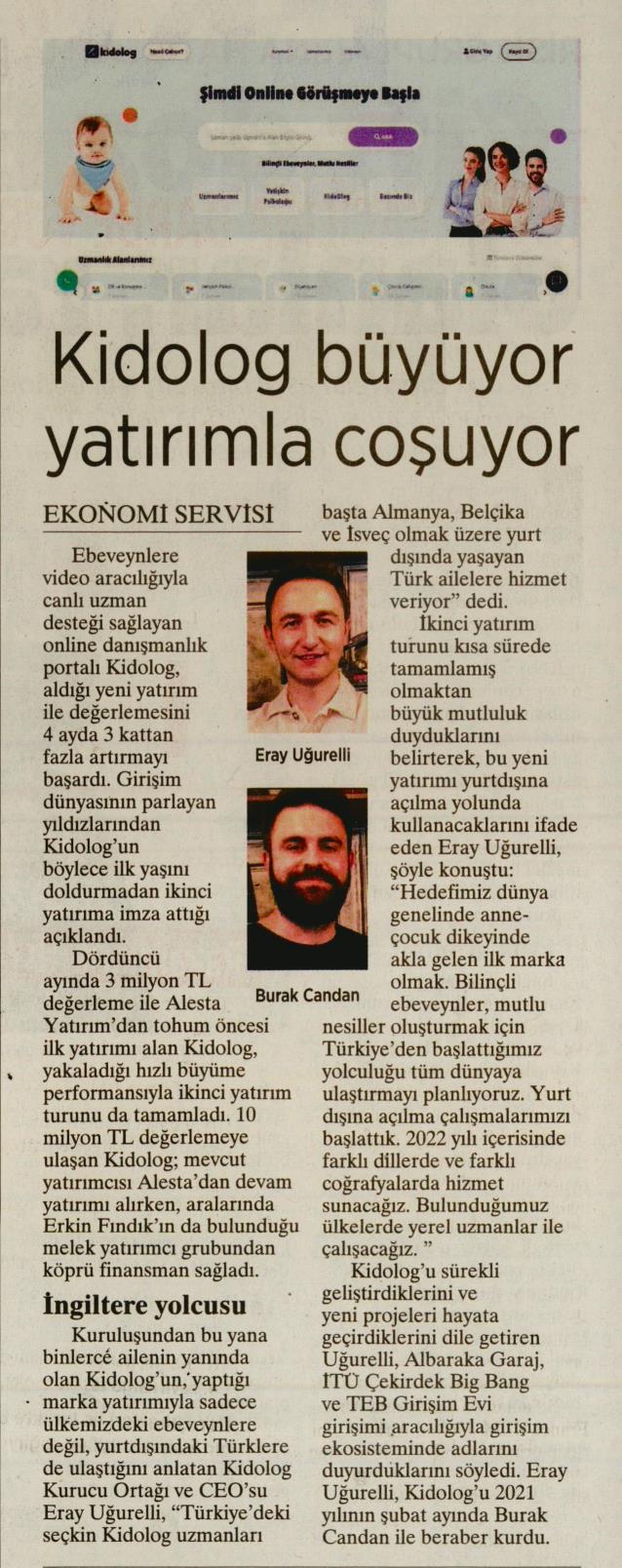 Kuluçka merkezimiz İTÜ Çekirdek girişimlerinden Kidolog, aldığı yeni yatırım ile değerlemesini 4 ayda 3 kattan fazla artırmayı başardı. Girişim dünyasının parlayan yıldızlarından Kidolog, böylece ilk yaşını doldurmadan ikinci yatırıma imza attı. Dördüncü ayında 3 milyon TL değerleme ile Alesta Yatırım’dan tohum öncesi ilk yatırımı alan Kidolog, yakaladığı hızlı büyüme performansıyla ikinci yatırım turunu da tamamladı ve 10 milyon TL değerlemeye ulaştı. Mevcut yatırımcısı Alesta’dan devam yatırımı alırken, aralarında Erkin Fındık’ın da bulunduğu melek yatırımcı grubundan köprü finansman sağladı.