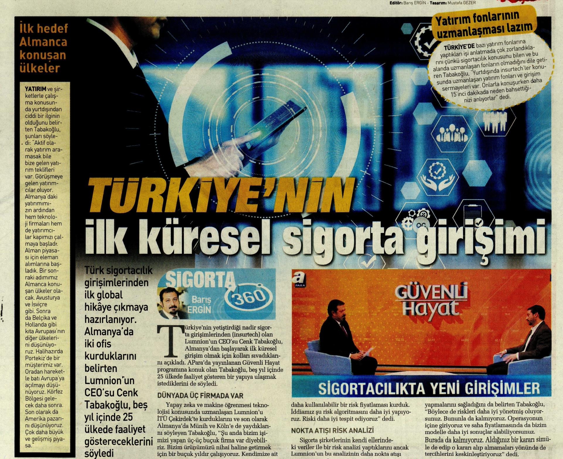 İTÜ Çekirdek girişimlerimizden ve Türkiye'nin yetiştirdiği nadir sigorta startup'lardan olan Lumnion'un CEO'su Cenk Tabakoğlu, APara'da yayınlanan Güvenli Hayat programına konuk oldu ve Almanya'dan başlayarak ilk küresel girişim olmak için kollan sıvadıklarını açıkladı. "Şu anda bizim işimizi yapan üç-üç buçuk firma var diyebiliriz. Bizim ürünümüzü nihai haline getirmek için bir buçuk yıldır çalışıyoruz. Kendimize ait daha kullanılabilir bir risk fiyatlaması kurduk. İddiamız şu risk algoritmasını daha iyi yapıyoruz. Riski daha iyi tespit ediyoruz" diyen Cenk Tabakoğlu, "Alman piyasası için eleman alımlarına başladık. Bir sonraki adımımız Almanca konuşan ülkeler olacak. Avusturya ve İsviçre gibi. Sonra da Belçika ve Hollanda gibi kıta Avrupa'sının diğer ülkelerini düşünüyoruz. Halihazırda Portekiz'de bir müşterimiz var. Oradan hareketle batı Avrupa'ya açılmayı düşünüyoruz. Körfez Bölgesi gelecek daha sonra. Son olarak da Amerika pazarını düşünüyoruz. Çok daha büyük ve gelişmiş piyasa" şeklinde konuştu.