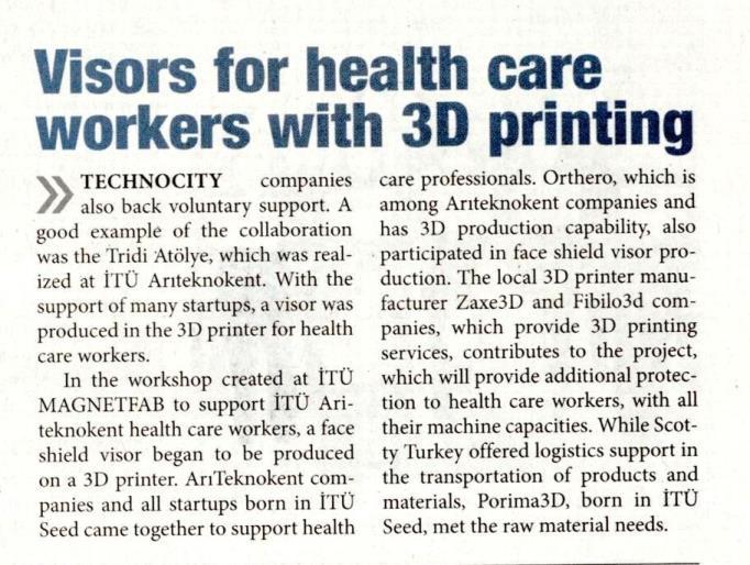 Technocity companies also back voluntary support. A good example of the collaboration was the Tridi Atolye, which was realized at ITU ARI Teknokent. With the support of many startups, a visor was produced in the 3D printer for health care workers. In the workshop created at ITU MAGNET FAB to support ITU ARI Teknokent health care workers, a face shield visor began to be produced on a 3D printer.