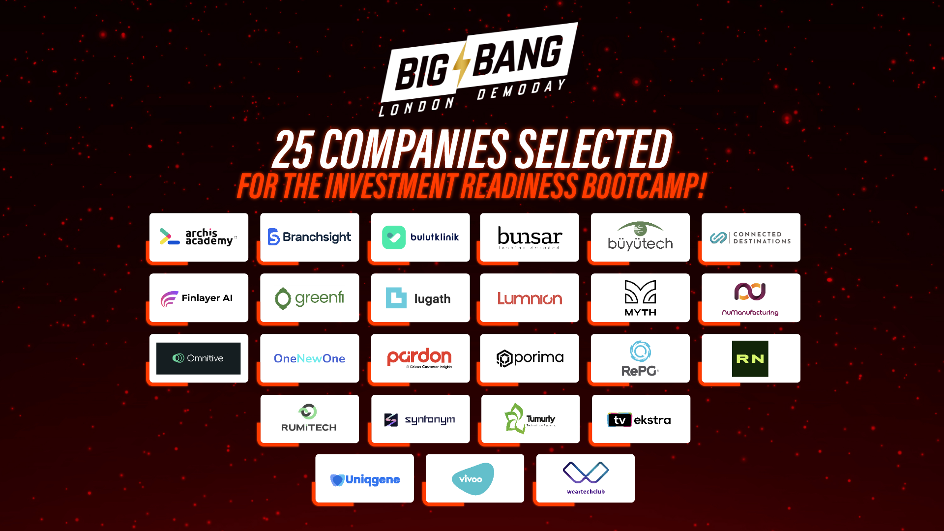 The 25 startups participating in the Big Bang London Demo Day include Archi's Academy, Branchsight, Bulutklinik, Bunsar, Büyütech, Finlayer, Connected Destinations, GreenFi, Lumnion, Lugath, MYTH AI, NuManufacturing, Omnitive Technologies, One New One, Pardon AI, Porima, RePG, RideNear, RumiTech, Syntonym, Tumurly, TV Ekstra, Uniqgene, Vivoo and WeartechClub.