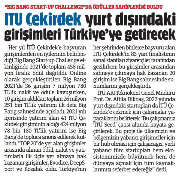 Her yıl İTÜ Çekirdek‘e başvuran girişimlerden en iyilerinin belirlendiği Big Bang Start-up Challenge etkinliği, bu yıl “Öncüler” mottosuyla önceki gün online gerçekleştirildi. Bu yıl 10. yaşını kutlayan Big Bang, yeni bir rekora imza attı. Her yıl olduğu gibi sahnede sunum yapan girişimlerin dışında fuayedeki girişimler hatta önceki yıllarda yarışan girişimler de aldıklarını yatırımları duyurdu. Big Bang sahnesinde 2020 yılında 54 milyon TL’yi bulan ödül, nakit ve yatırım miktarı bu yıl yüzde 748 artışla 458 milyon lirayı aştı. Big Bang 2021’de 36 girişim 7 milyon 780 TL’lik nakit ve ödüle kavuşurken, 10 girişim aldıkları toplam 26 milyon 251 bin TL’lik yatırımı ilk defa Big Bang sahnesinde açıkladı. Daha önce Big Bang sahnesine çıkmış, 41 İTÜ Çekirdek girişiminin 2021 yılı içinde aldığı aldığı 424 milyon 78 bin 180 TL’lik yatırım ise Big Bang’de topluca anons edilerek kutlandı. İTÜ ARI Teknokent Genel Müdürü Prof. Dr. Attila Dikbaş, 2022 yılında yurt dışındaki startuplan da İTÜ Çekirdek’e çekmek için çalışmalar yapacaklarını belirterek “Bu çalışmamız İTÜ Seed’ çatısı altında hayata geçirilecek. Bu proje ile ülkemizin ve bölgemizin yabancı girişimciler için bir hub olması için çalışacağız, yerli yabancı tüm startuplan hem ekosistemimizde büyütmek hem de dünyaya açmak için tüm kaynaklarımızı seferber edeceğiz” dedi.